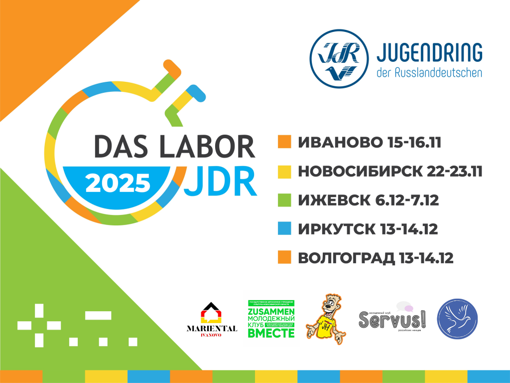 Продолжаем традиции прошлых лет — проводим «Лабораторию на колесах» в пяти городах России. Молодёжь сможет посетить двухдневные семинары, на которые будут приглашены эксперты, чтобы осветить востребованные для ребят темы. К участию приглашаются активисты молодежных клубов и организаций российских немцев, а также все интересующиеся немецким языком и культурой российских немцев.